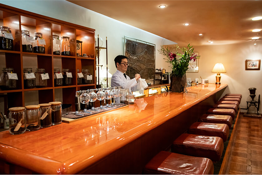 The counter features unique recesses that customers appreciate for comfortably reading books or observing the siphon coffee brewing process.